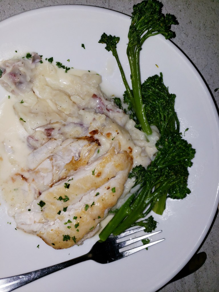3. The Pan Seared Grouper I totally recommend. Its grilled grouper on a bed of mashed red potatoes with a buttery sauce, broccoli next to the grouper and potatoes also, with a buttery taste. It’s served in a glass type bowl with metal utensils, in which I prefer glass over plastic.